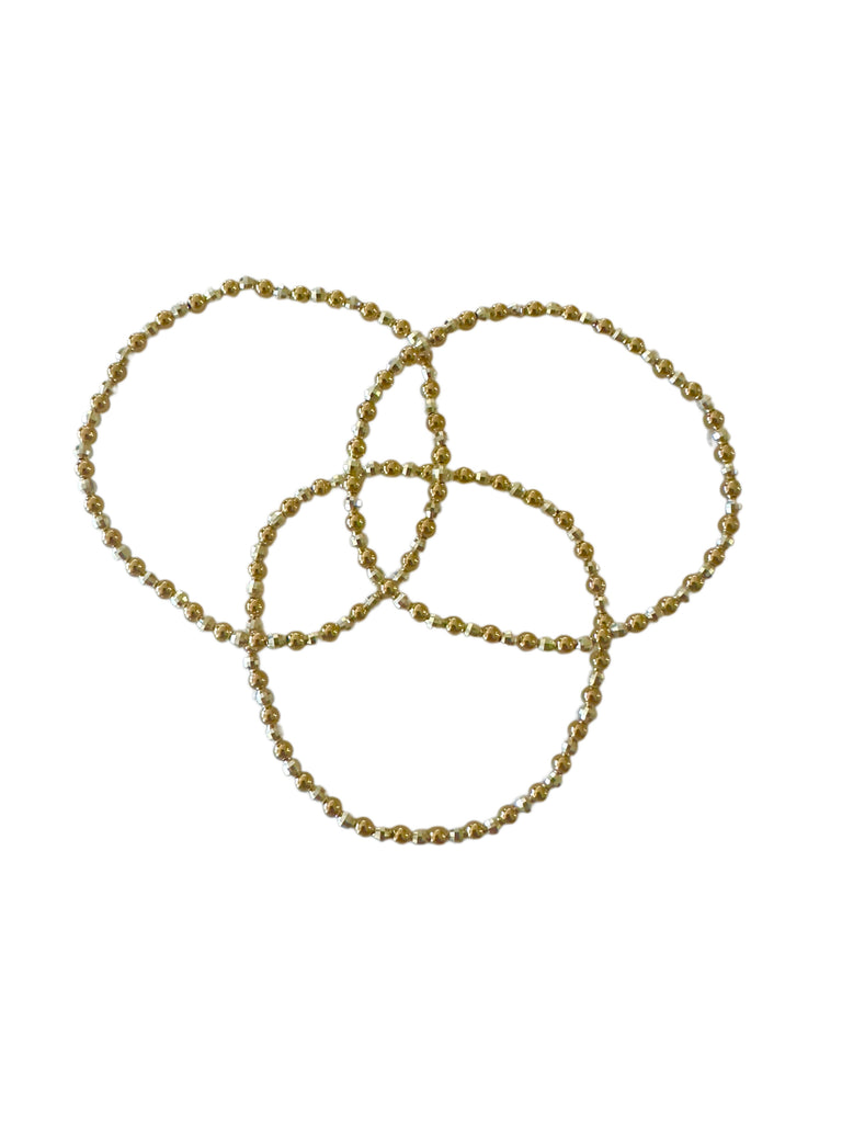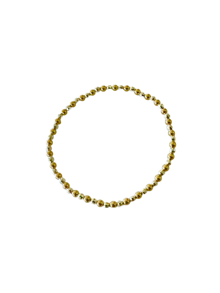 The Crisel Bracelet offers a beautiful two-toned design combining 14kt gold-filled and sterling silver for a sophisticated look. Its elastic construction provides comfortable, easy wear that adapts to your wrist perfectly. Waterproof and tarnish-free, this bracelet keeps its shine through daily adventures. Choose between a 7-inch size or an 8-inch option for larger wrists, ensuring the ideal fit and timeless elegance for any occasion.