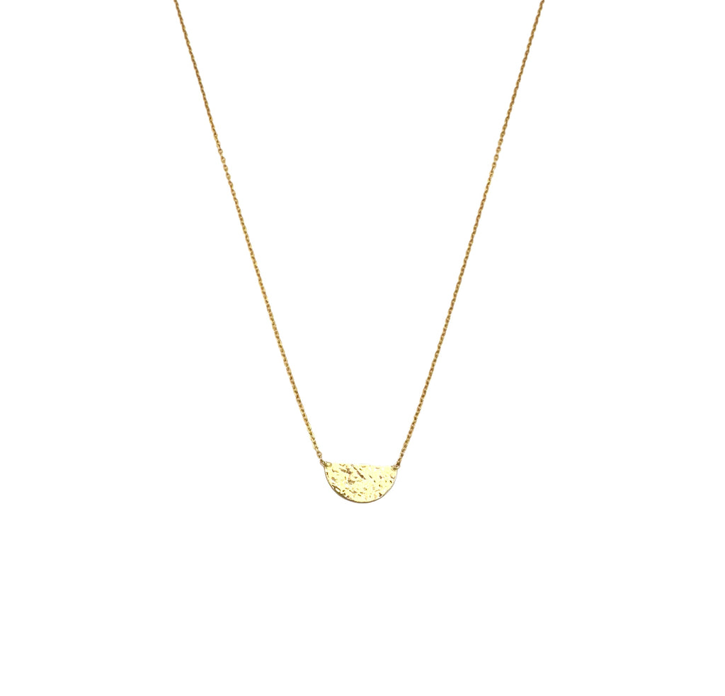 Embrace timeless elegance with this stunning 14kt gold-filled half moon necklace. Each piece showcases a hand-hammered crescent that reflects light in its own beautiful way, giving you a necklace that's authentically yours. Whether you're dressing up or keeping it casual, this versatile accessory seamlessly complements your personal style. Crafted for durability, it resists tarnish and handles water with ease—wear it confidently through workdays, workouts, and everything in between. Simple in design yet rich in character, this is the necklace you'll treasure for years to come.